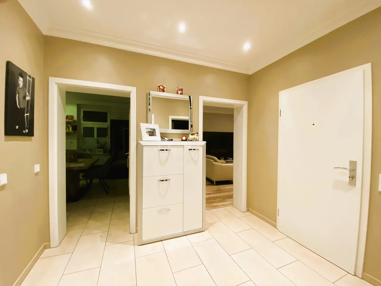 Die Ausstattung der Wohnung überzeugt durch zahlreiche Highlights. Das Badezimmer ist modern gestaltet und verfügt über eine Komfort-Badewanne, ein Fenster, Einbauschränke sowie einen großen Waschtisch. Die Decken im Flur, Wohnzimmer und Badezimmer sind abgehängt und mit Deckenflutern ausgestattet, die für ein einladendes Ambiente sorgen. Hochwertige Lichtschalter und Steckdosen runden das Angebot ab.