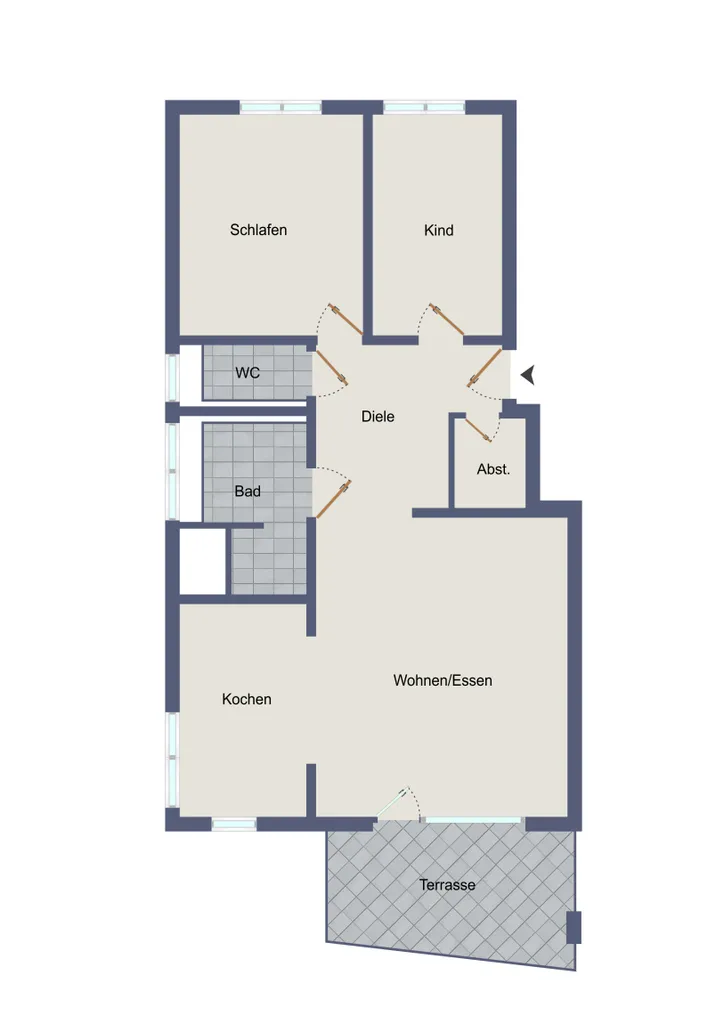 Wohnzimmer, Badezimmer, Schlafzimmer, Kinderzimmer, Abstellraum, große Terrasse, Keller, Garage