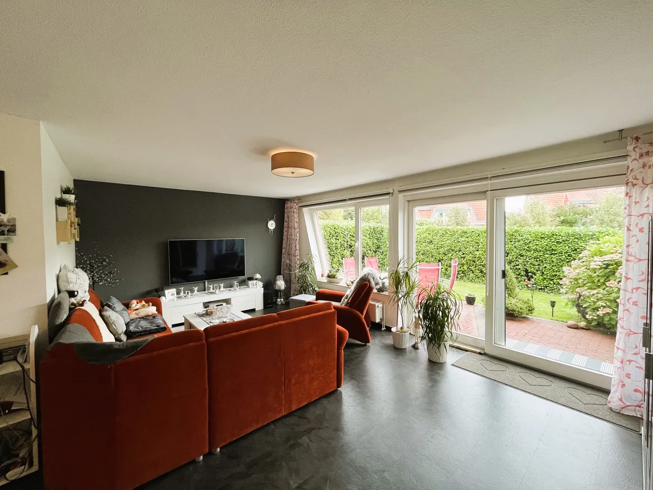 Erdgeschoss: Wohnzimmer, Essbereich, Küche, Gäste-WC mit Dusche, Terrasse und Garten