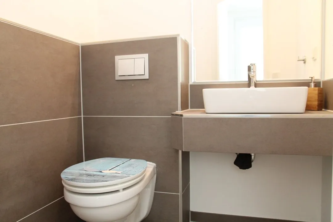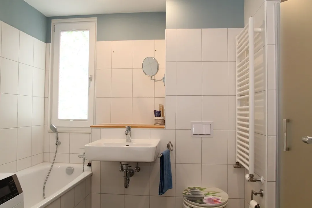 Im Obergeschoss befinden sich zwei große helle Zimmer und ein Badezimmer mit Wanne, Dusche und Fenster. Im Dachgeschoss sind zwei weitere Räume und ein kleines Badezimmer mit Dusche.