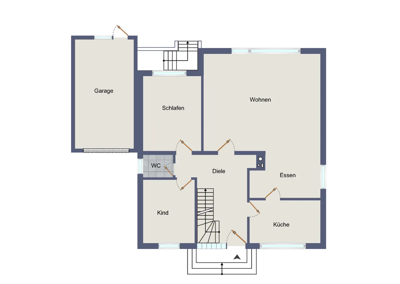 Erdgeschoss: Wohnzimmer, Essbereich, Küche, Schlafzimmer, Kinderzimmer, Gäste-WC
