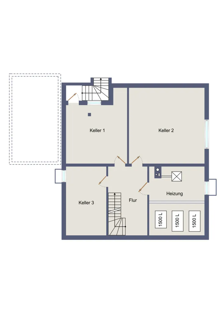 Keller: 3 Kellerräume, Heizungsraum, Kellerausgang