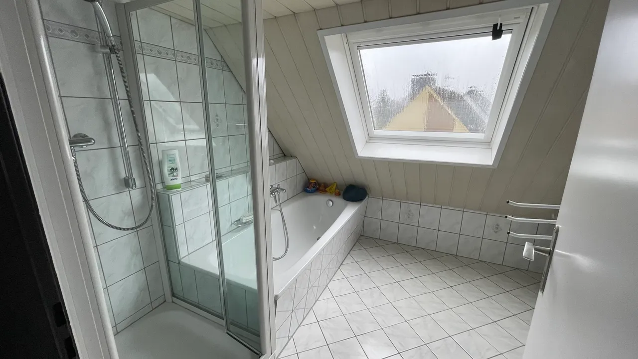 Dachgeschoss: Badezimmer mit Dusche und Badewanne, kleines Zimmer